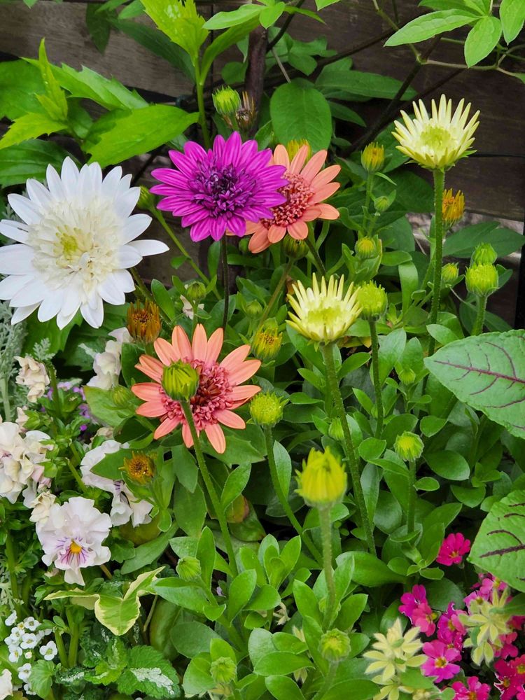 挿し芽を寄せ植えにしたオステオスペルマム、今朝、綺麗に咲いています。💗💛💚