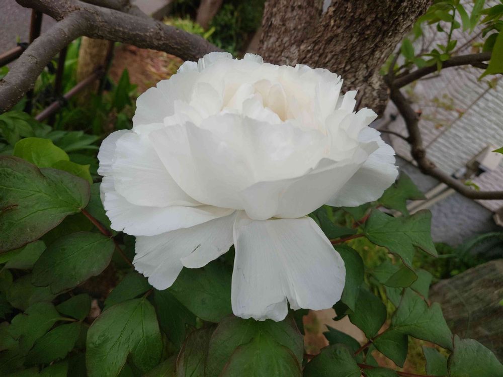 強風の中、純白の牡丹が咲きました❗。ほんとにきれいなお花です❣️👌。