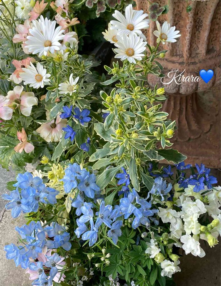 冬の寒さ乗り越え咲いてくれたオステオスペルマム ザイール バリエガータ🤍 斑入り葉が好きで毎年お迎えしてましたが やっと今年は冬越しに成功しブルーのデルフィニウムと寄せ植え爽やかなコンテナーが出来上がりました✨💙