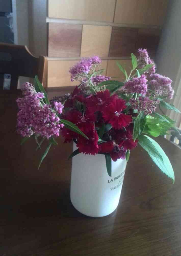 切り戻しで、シモツケとナデシコと、アジサイを飾りました~
