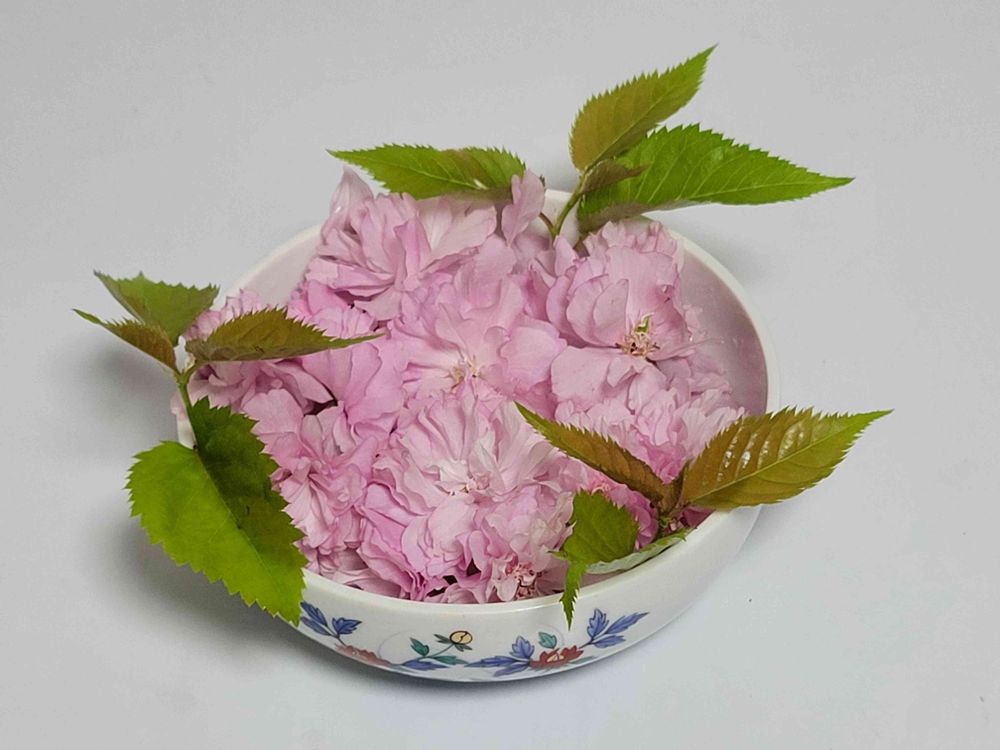 フワフワの八重桜と添えられた桜の葉も艶々で素敵ですネ~🌸🌸🌸
