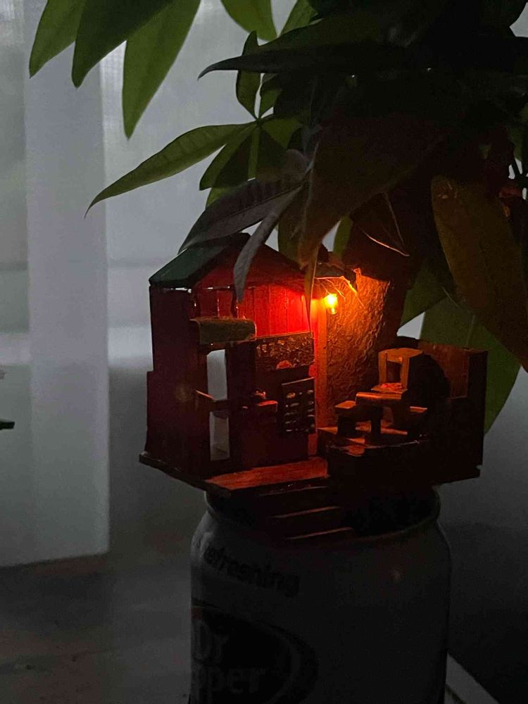 百均やら、 ホームセンターで売ってる 一番小さい観葉植物に、 ちっさい家、作ったりしてます。 ちっさい家用の家具も作ります。 窓にお弁当のふたとかのプラ貼って ガラスっぼく…電気もつきます💡