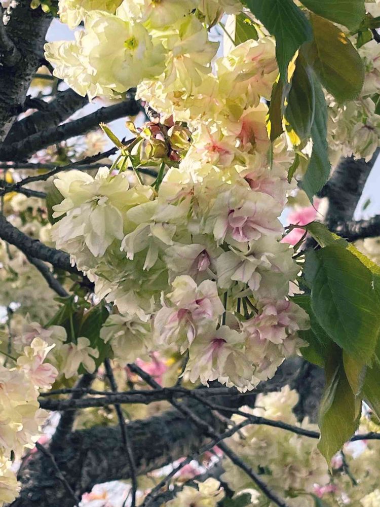 今年も(この鬱金さんはご近所さんの🌳かな…🙄)この色合いが間近で見られたのですね✨🙌✨ヤッタネ✨淡いグリーンと少しだけピンクに色付いた桜🌸