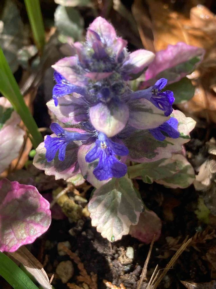 外周の低木チームの足元にアジュガ数種を植えていますが、日照少ない隅っこでなんとか育って咲きました❣️