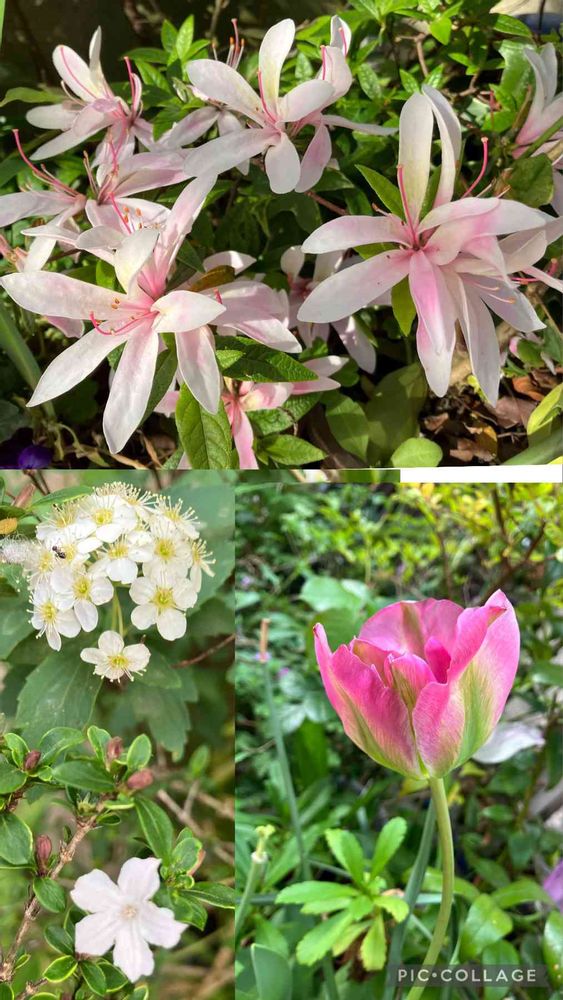 今日のお花のツツジが満開です。新しいチューリップも咲きました。コデマリの下にいつのまにかハクチョウゲの可愛い花も咲いています♪
