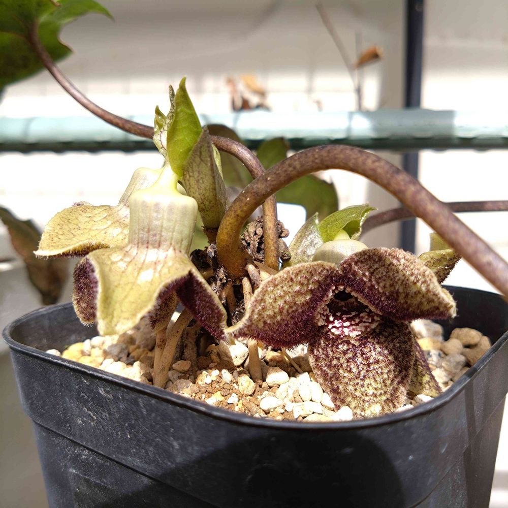 黄砂にめげず植物の外出し作業の後、カンアオイの花が咲いていたので写真を撮ろうとして