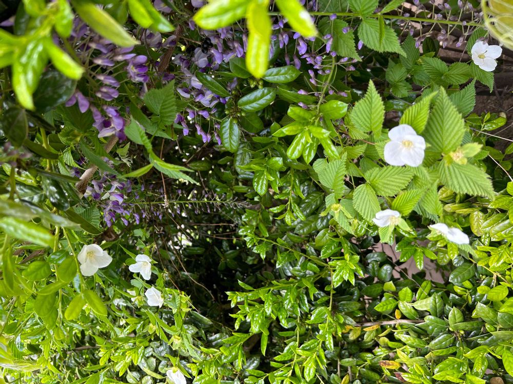 隣のお庭のしろやまぶきの白い可憐な花とその芸術的な葉っぱ!