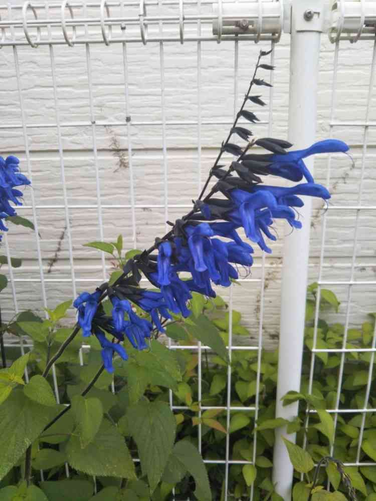 この青い花で黒い茎の植物の名前は、サルビア・グアラニティカといいます。