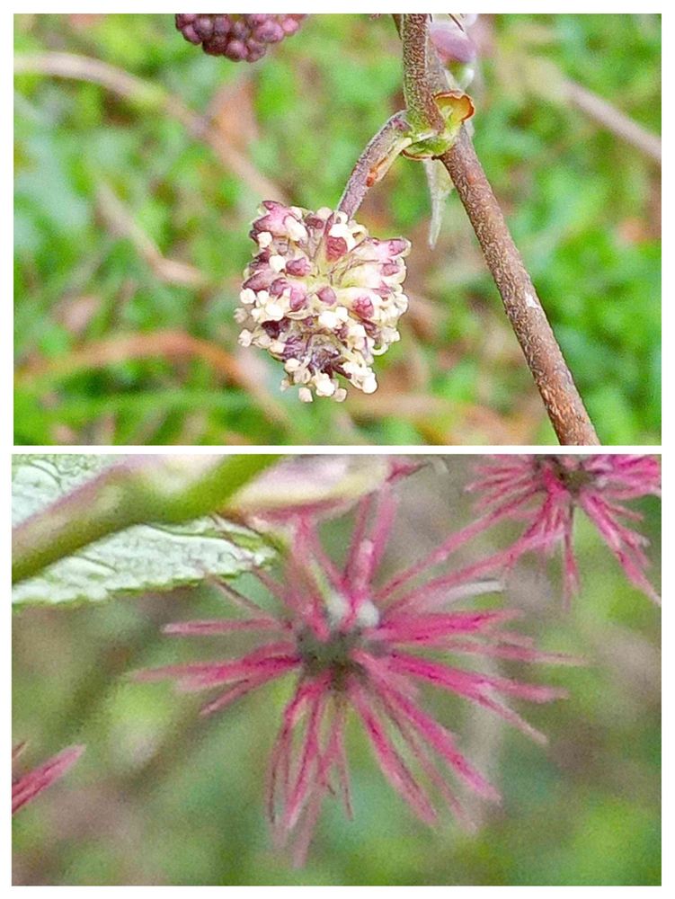 花全体が雄しべのかたまり 雌花はまるでムラサキウニのよう 果実はイチゴ 変な植物です🍴❤️🎵
