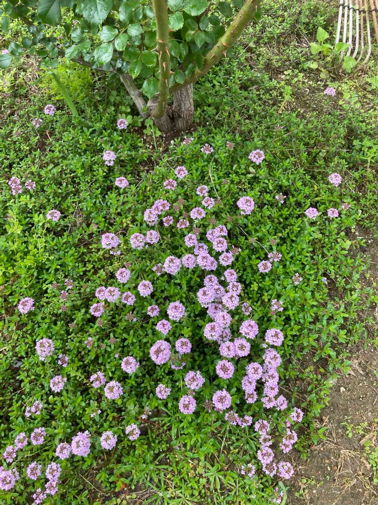 タイムの花が咲きました。ピエールドロンサール(バラアーチの大きなバラ)の株元に這っている従姉妹からもらったタイムです。