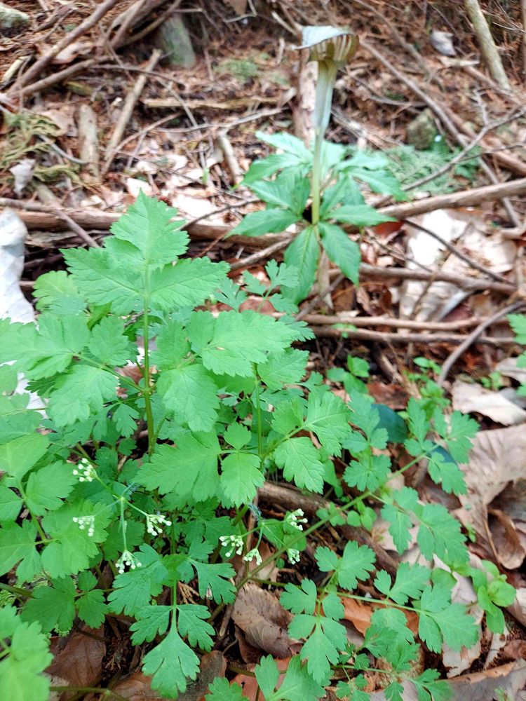ミミガタテンナンショウに見守られるように咲いていたヤブニンジン🌿白い蕾が開いてなくて残念でした😅