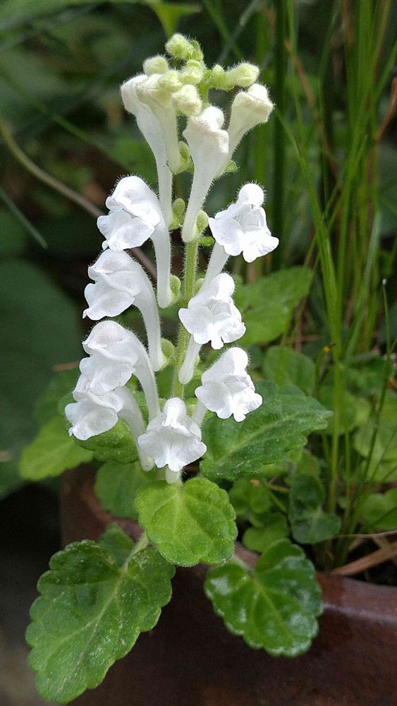 置きっぱなしの平鉢に、いつの間にかタツナミソウが住み着いて、白いお花を咲かせています。