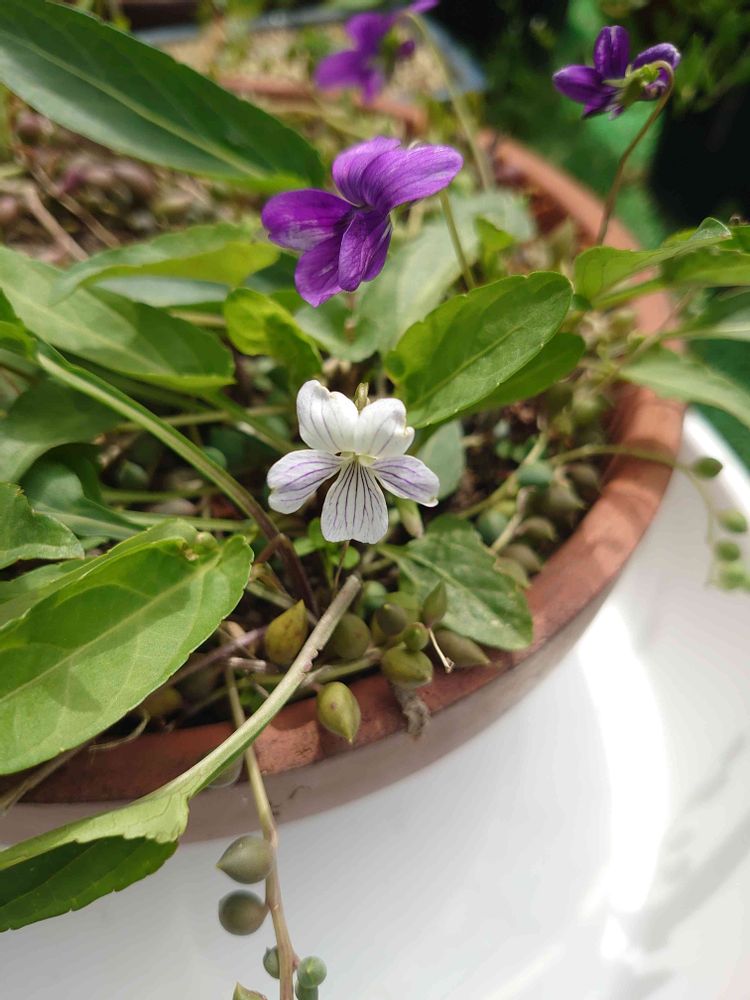 紫のスミレが元気に咲いてて白は全滅でこぼれ種なかったのかなぁ〜って思ったら咲いてくれたぁ〜この子だけ💖まだ花咲いてる最中なのに大きなトレイの上に載せて種を無駄にしない作戦にしたよ(*^^*)