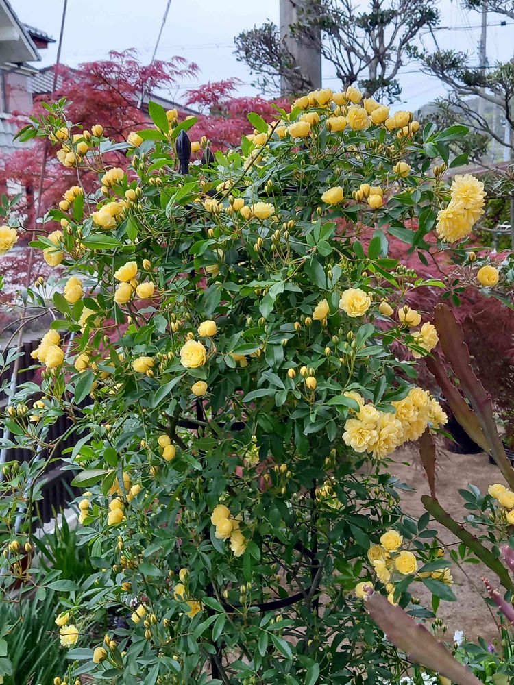 今晩の強風注意報で、モッコウバラがまた倒れないよう、鉢を地面に直置きにしました。