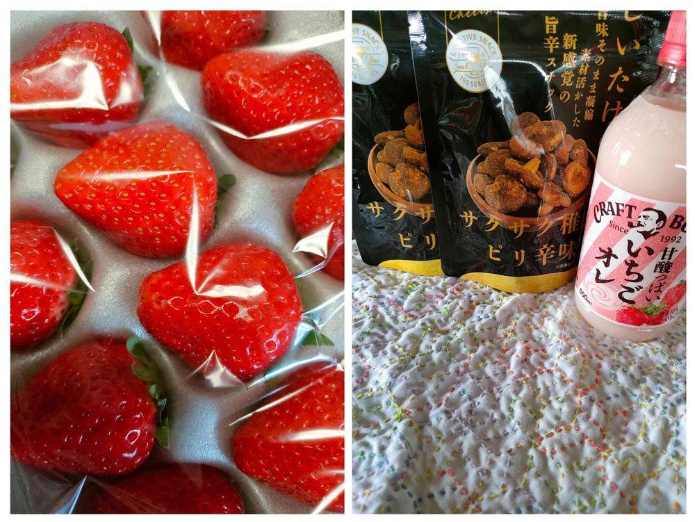 今、はまっている🍄のお菓子と、🍓のドリンクと、下は、絞りみたいな刺し子です。全面縫目だらけなので、難しかったけど、頑張りました。٩((灬∀灬))۶エヘッ*+