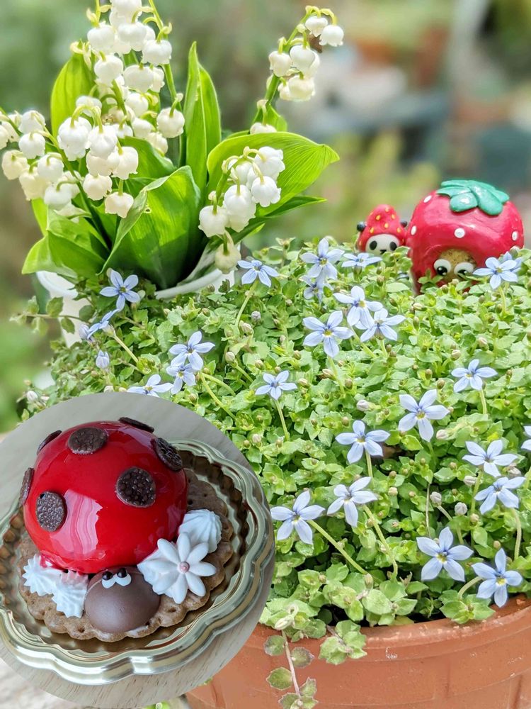 色違いのラベンダー色のプラティア 葉っぱの色も明るくて私のとは雰囲気違いますよね〜 てんとう虫のケーキ うちの近くのあのケーキ屋さんのかな?