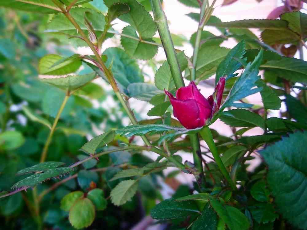 我が家の今年一番最初に色づいたバラの蕾は赤のミニバラでした。