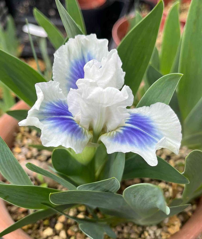 改良園で売られていた品種でカタログの写真はパッとしない感じでしたが、実物は白花に万年筆の青いインクを垂らして染みていくような感じの、綺麗なグラデーションのSDBです。