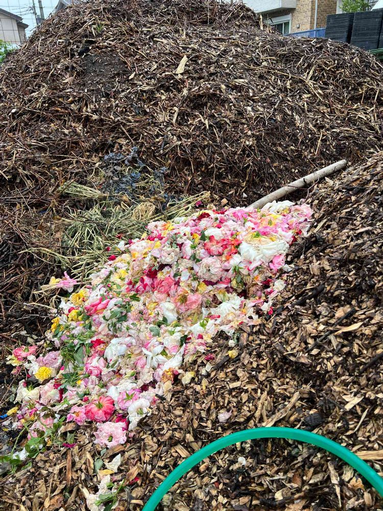 駐車場裏には摘まれた花殻が。横たわりたい…晴れていたら。結構な降りでしたが、注文した薔薇をお迎えに来る人、見に来る人で駐車場は満杯でした。