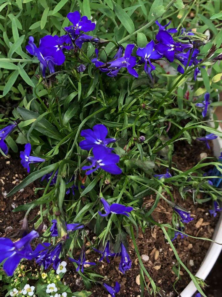 寄せ植えの空いたスペースにロベリアをを植えました。濃い青紫の小さなお花が綺麗です💙💜💙💕💕