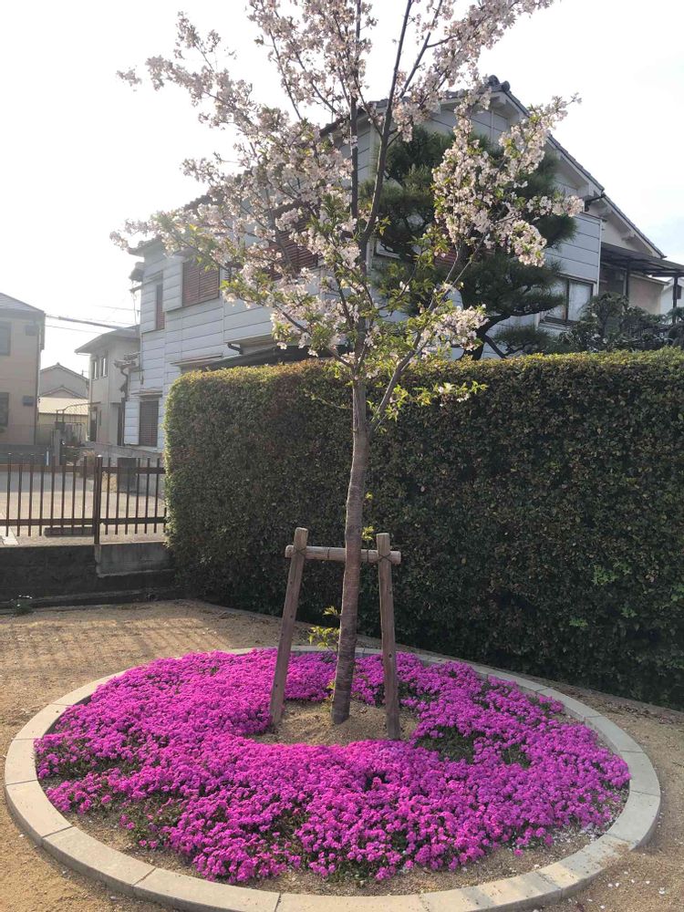 花のボランティアの作業場の施設の桜と芝桜のコラボが綺麗でした。