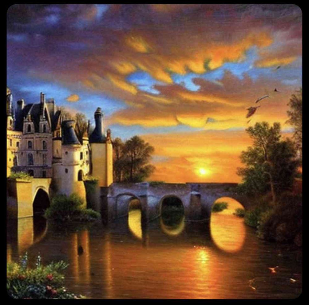 10K,高品質,写実的,油絵, 風景画 , リアル, 絶景スポット, シュノンソー,フランス,ヨーロッパの名城,夕暮れ