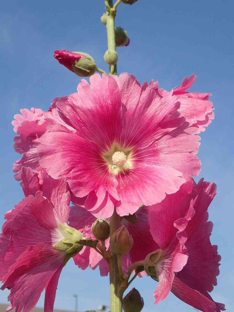 青空に向かって咲き登るタチアオイのお写真、梅雨の走りの様な此の天気を吹き飛ばしてくれますね🎶٩(ˊᗜˋ)
