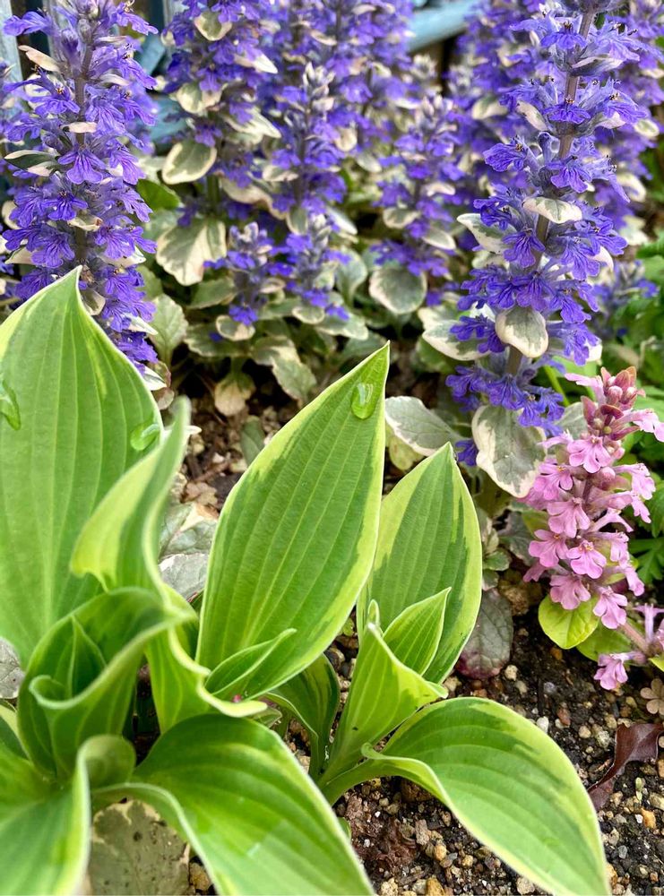 ホスタさんもアジュガさんも、どちらも斑入りで…共演です😊