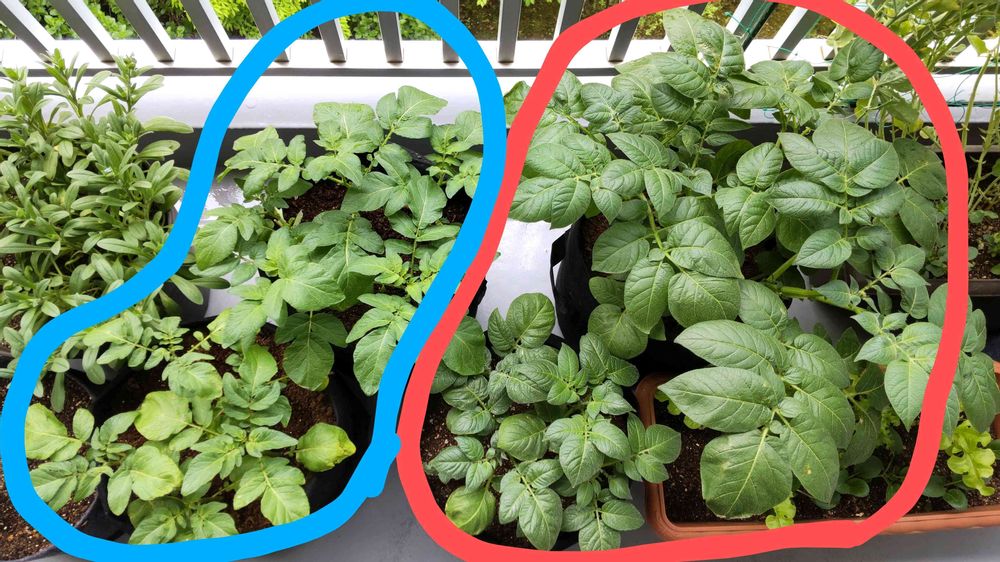 分からなくなったら困る…とネームプレートを立てたけど、まったく別の植物であるかのごとく姿の違うジャガイモ2品種