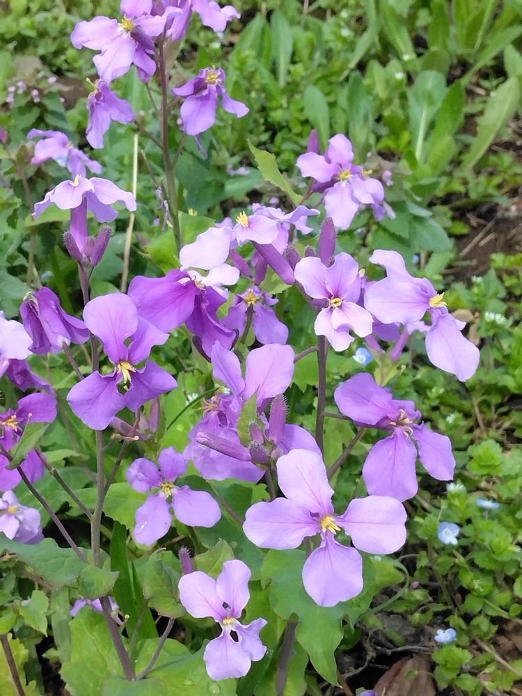 別名はショカツサイ、ムラサキハナナは「紫色の菜の花」の意であるが、単に菜の花に形状が似ているだけでなく、野菜としての利用や種から油を採取する点などでもアブラナとの共通点が見られる。