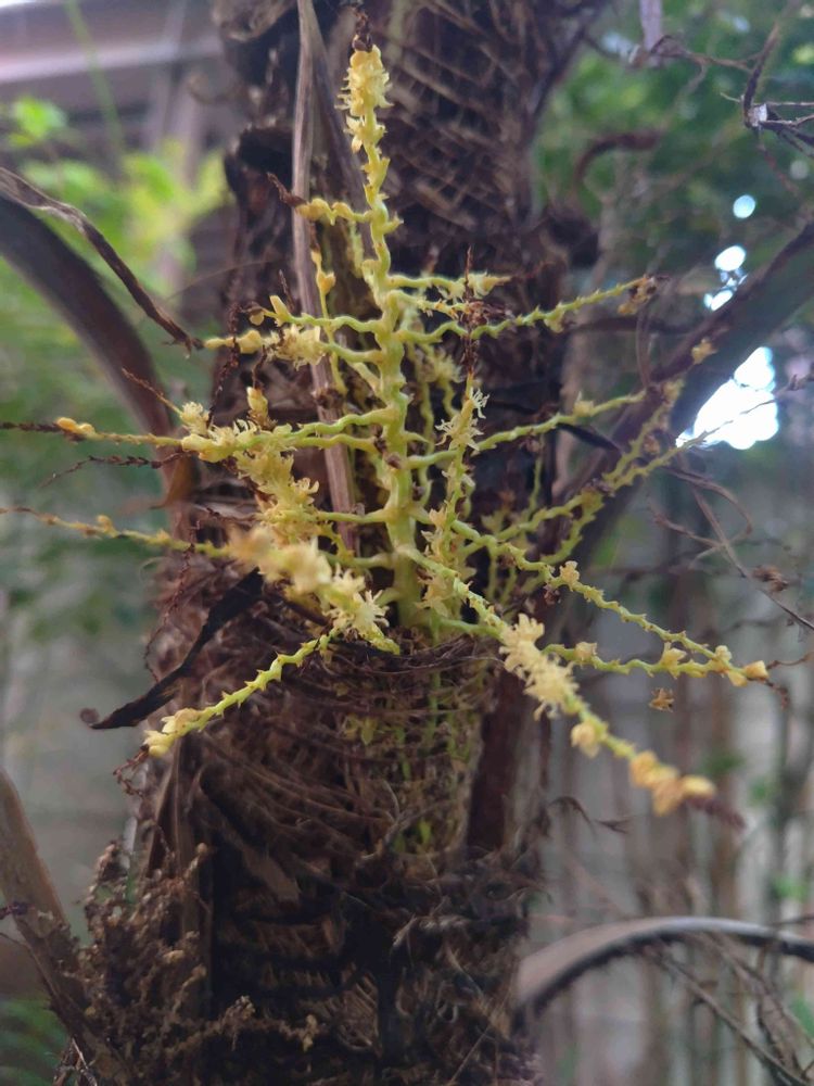 花は咲き進んでいるようですが、花序が全然伸びず根元の方は幹を覆う繊維に阻まれて潰れてしまっています。