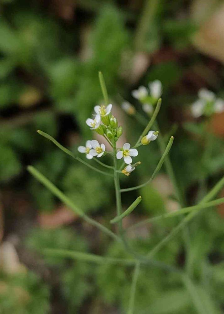 道ばたで見つけた小さな花ですが遺伝子研究のモデル生物だそうです。染色体が10個(5対)だけとコンパクトで世代交代が2ヶ月と短い等、研究に有利な植物です。宇宙ステーションや月表面にも実験生物として持ち込まれています。