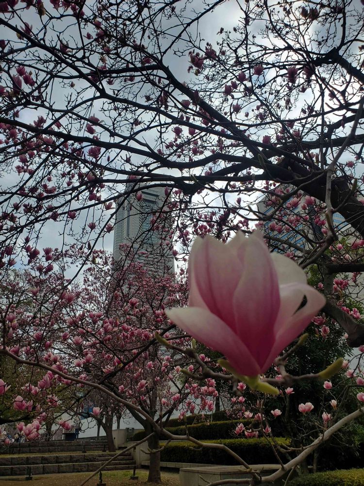 もくれんとバックのランドマークタワー🏙️のコラボが素敵✨ですね。ザ・ヨコハマって感じです。