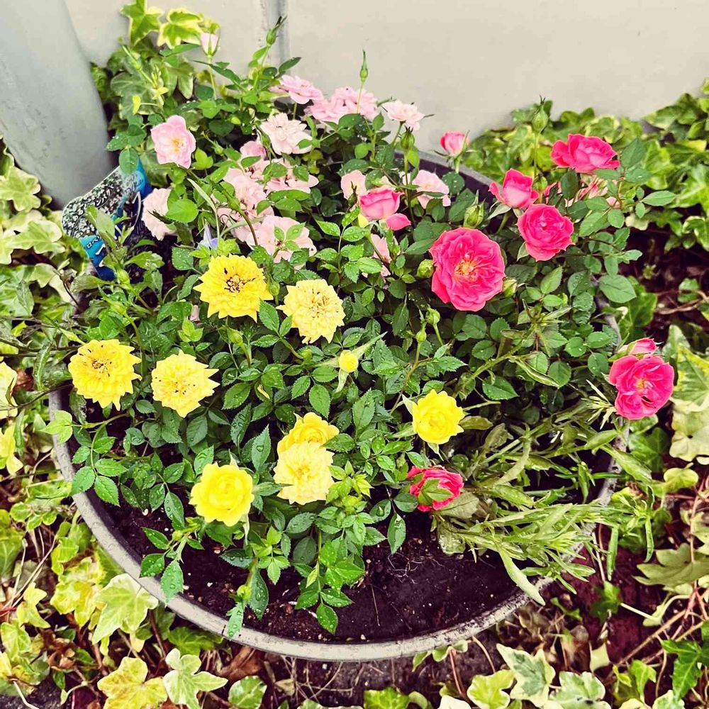 スーパーでミニバラがお安く売ってたので寄せ植えにしました。3つで1000円。