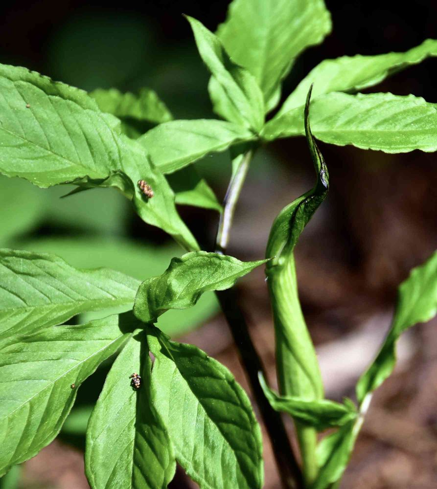 まだ花が立ち上がったばかりで付属体のヒゲも出ていませんね。ウラシマソウと同じように長い付属体を出しますが、ウラシマソウが垂れるのに対し、オオハンゲやカラスビシャクのは上に立ち上がります😍