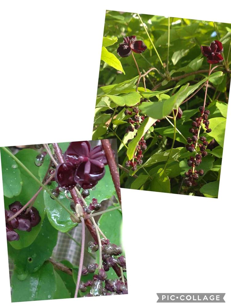 買い物の帰り 道路沿いのお宅のガレージに GSの皆さんの投稿で拝見したことのあったアケビのお花に出会えました