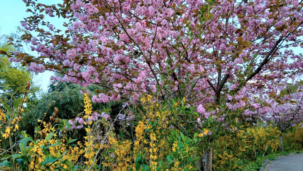 八重桜と連翹、この辺りは坂で息が切れて写真撮るのも大変💦
