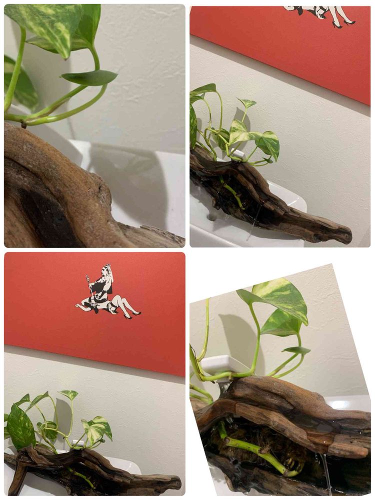 こちらはtoiletryの爆イケポトスです✨水耕栽培から取り出し流木とフューチャリングさせて根っこが剥き出しだとあぶないので水苔で巻いています。
