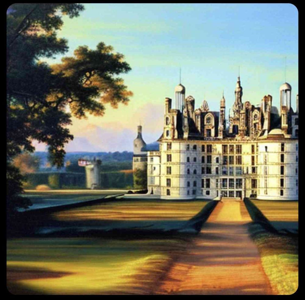 10K,高品質,写実的,油絵, 風景画 , リアル, 絶景スポット, シャンボール城,フランス,ヨーロッパの名城,夕暮れ,幻想的