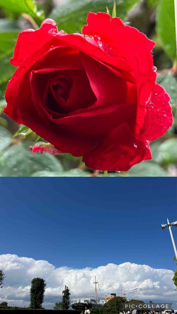 我が家の赤いバラの一番花が咲きました。雨の中でも素敵です😍。大きなバラの木には蕾が沢山。楽しみー❣️次の日は晴れて山下公園の空は快晴で濃いコバルトブルーがとってもきれいでした♪