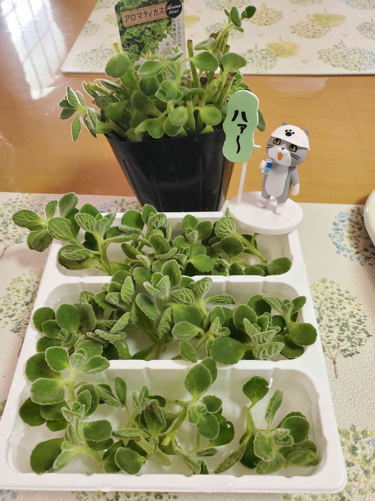 一昨日のGSマルシェで買ってきたアロマティカス。とっても大きくて良い苗でした😊増やすために✂️しました。何時もは切ったら土に指していましたが、根を出してからやっていた方がいらっしゃったのでやってみました🎵 大寒波で駄目になり少ししか残ってないのでまた増やしたいな~