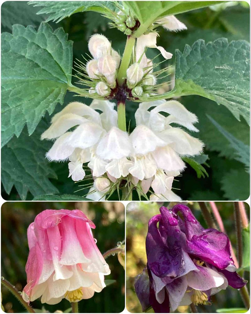 タイリクオドリコソウ(大陸踊子草、別名ラミウム)さんと、姫オダマキさん二色🤍💗💜