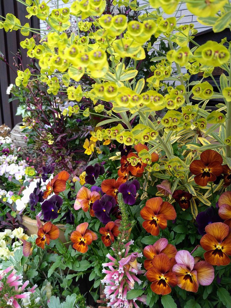 玄関先のユーフォルビアとアンティーク色のビオラ達が素敵になりました✨🧡🤎💜🖤✨