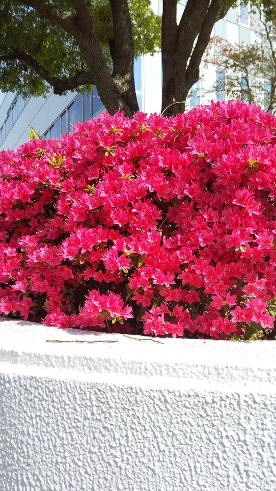 真っ白な壁に真っ赤なお花「ミヤマキリシマ」が映えます。今年は満開が早く、ビックラポンや!🌺🌿😮😊🌞✌️