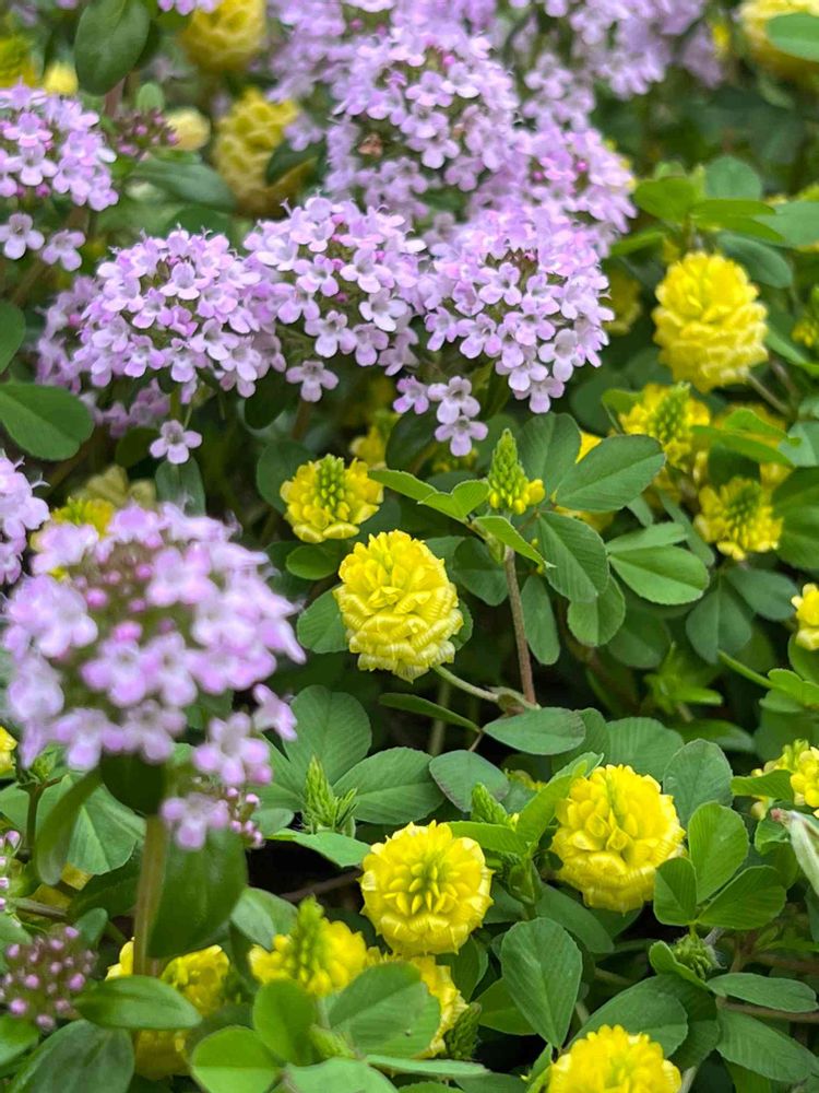 クリーピングタイムと咲き競うようにトリフォリウム・カンペストレの黄色い小さな可愛らしいお花が咲き始めました♫素敵な共演です(ღ˘⌣˘ღ)。o♡