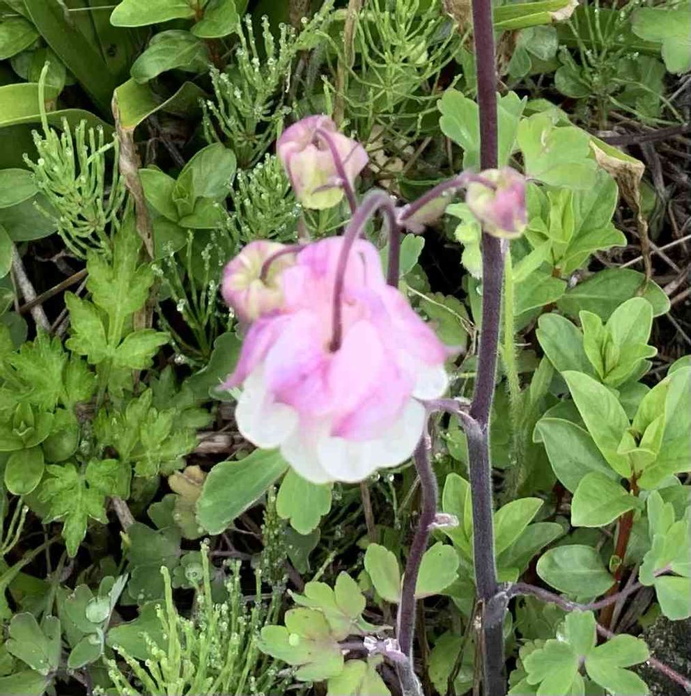 ミソハギの新芽の中に,零れ種からの西洋オダマキ💕