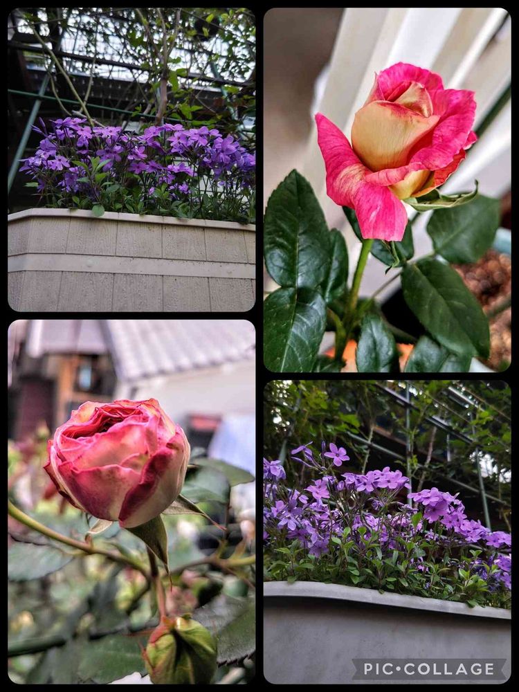 紫色の花は、4年以上咲き続けてくれているツルハナシノブ(宿根草)です。鉢いっぱいになったので、2つの鉢に分けました。