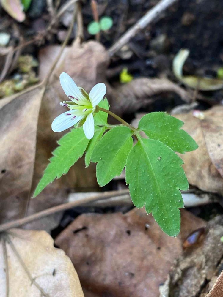 落葉樹林の林床に生える。タネツケバナ属は多くが葉が羽状複葉になるが,本種は3小葉になる。
