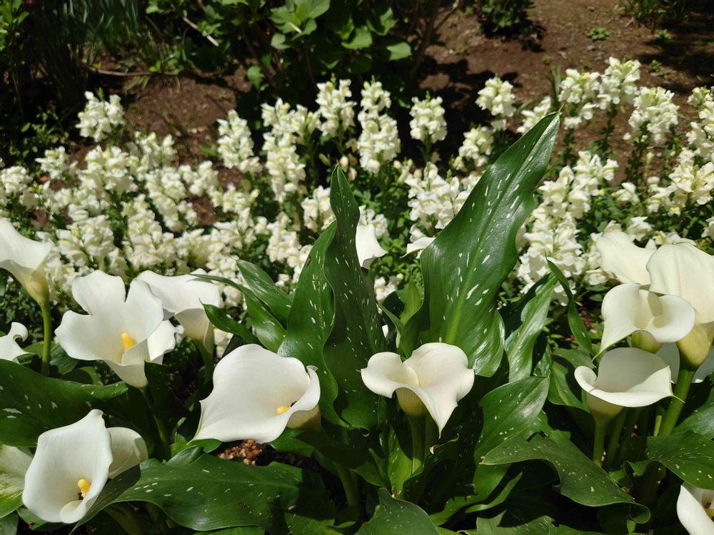 真っ白なカラーとキンギョソウが綺麗に咲いていました。