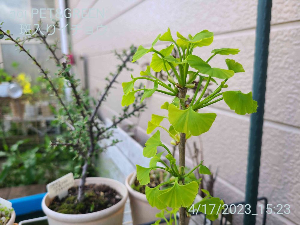 ウチのこの斑入りイチョウは二度目の春を迎えたところです。夏に結構育ったので、今夏も期待してます♪